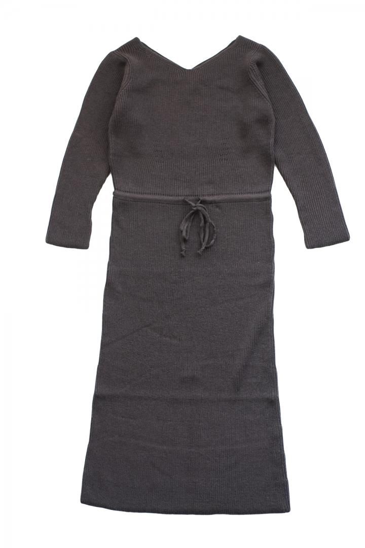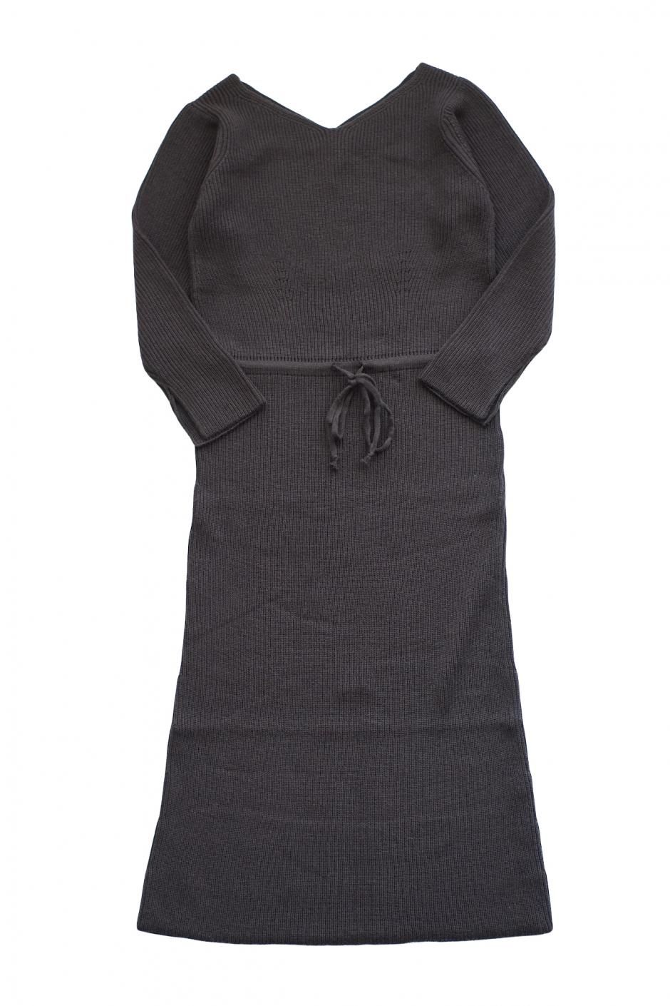 バレースーツ、ジッパースーツと同様なぬめりのあるエクストラファインウールで編んだニットドレス。 大きめにレイアウトされたネック周りはフェミニンな表情を持つ。