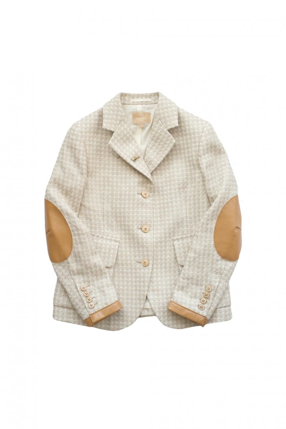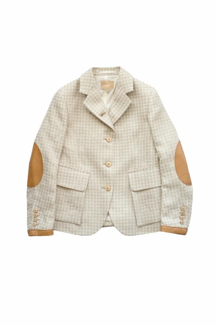 1920年代の乗馬用ツイードジャケットがモチーフで、袖口、肘に補強用レザーを配した定番ジャケット。変化に富んだ意匠糸を使用することで生まれた、表情豊かなコットンリネンのファンシーツイード。ライニングは薄いコットンの総裏仕立てなので肌触りがよく長い期間ご着用頂けます。