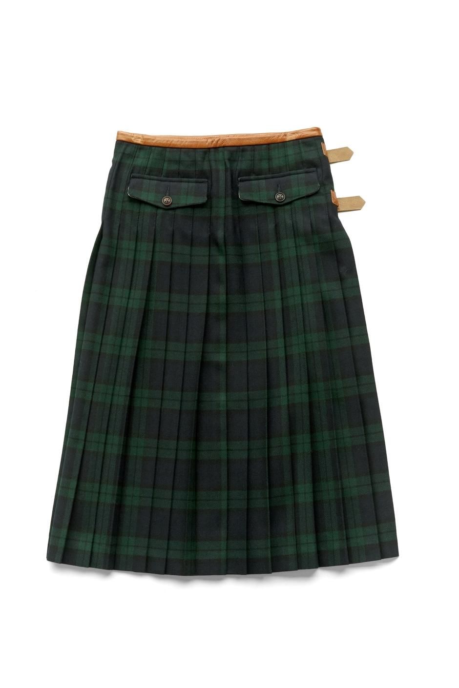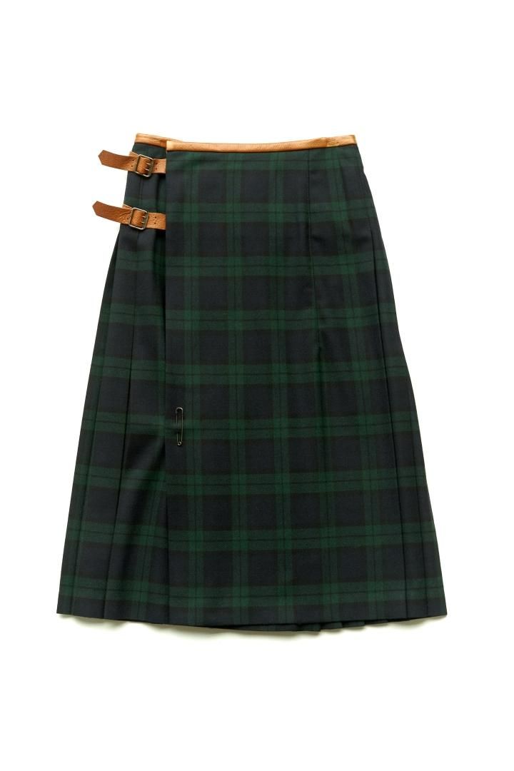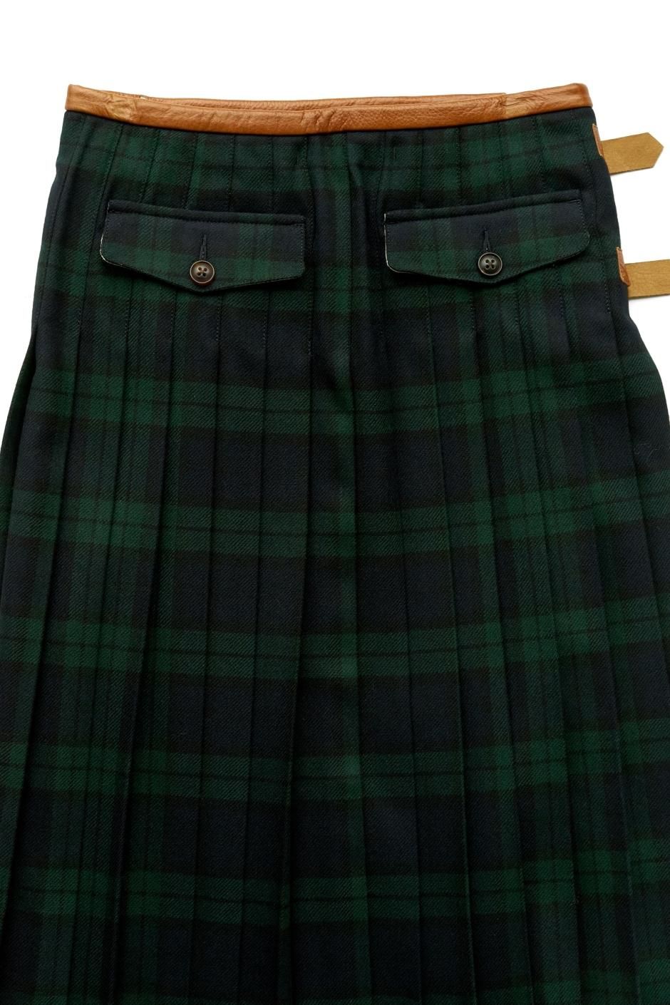 1772年に英国西部のサマセット・ウェリントンで創業した老舗生地メーカーである、FOX BROTHERS。FOX BROTHERS社製の伝統的なブラックウォッチを採用したシリーズ。 1910〜45年代スコットランド軍で着用されたキルトスカートは、このブラックウォッチでした。 ブラックウォッチという名前の由来は、ハイランド地方の歩兵隊から来ており、彼らが黒のタータンチェック柄の制服で警護を行っていたことから、ブラックウォッチ=「黒い見張り番」、というニックネームがつき、そのまま柄の名前になったと言われています。 この当時のキルトスカートとブランド定番のキルトスカートをMIXさせた新しいキルトは、ウエストとミニベルトに蝦夷鹿のレザーを使用し、前端にキルトピンを取り付けました。