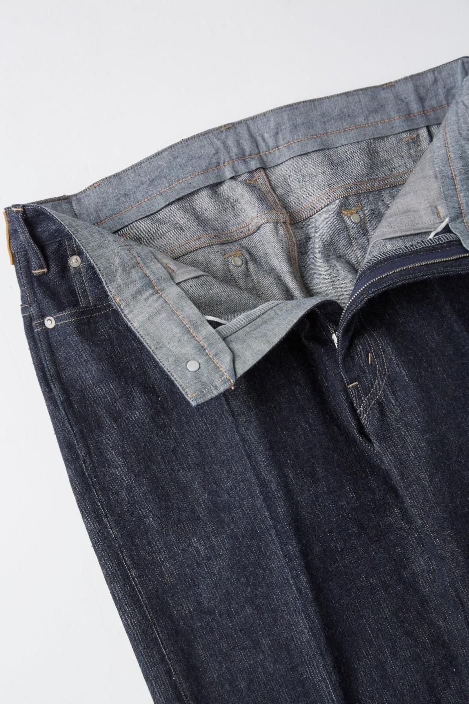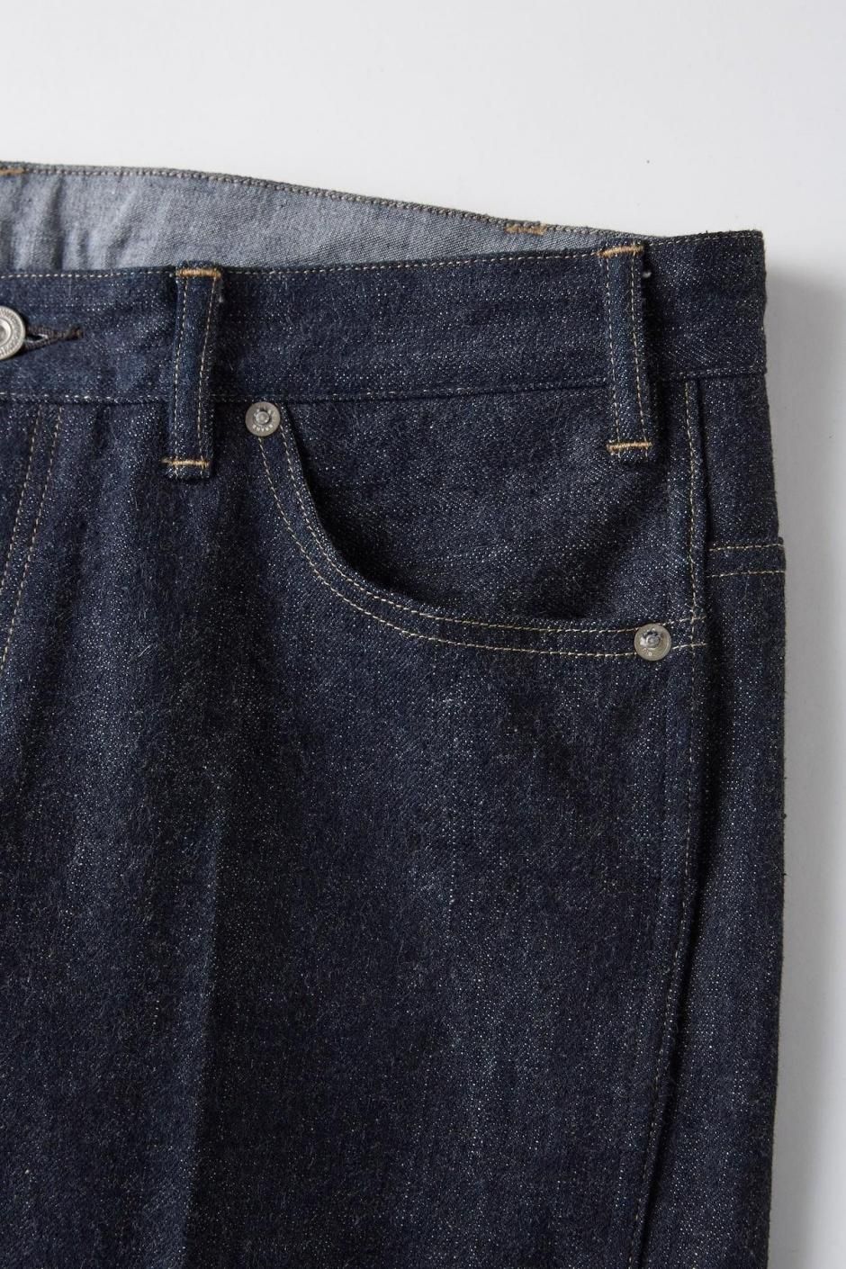 12.4oz OLDJOE original denim糸から拘り、オリジナルのバルキーさを表現し、ラスティックなネップ感を入れ込み、デニムの産地、井原にて製作しています。 経糸にムラ、ネップ形状の強いものを黒味の強いインディゴ染料で染色し、ヨコ糸は比較的ベージュ味の綿を厳選し強撚をかけて糸にしております。生地はいわゆるキバタと言われる織り上がった状態のものから、特殊な方法でサンフォライズ(防縮加工)のみをかけています。 通常の防縮方法とは違いますのでいわゆるリジッドデニムと呼ばれる表面にノリが付着した固い生地にはならず柔らかな手触りを表現しました。風合いや色味の重厚感、実際手に取った時の質感や、着用時の履きやすさ、糸使いも含めて、 OLDJOEならではのプリミティブかつモダンな存在感を持ったオリジナルデニム。