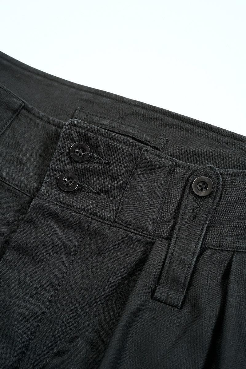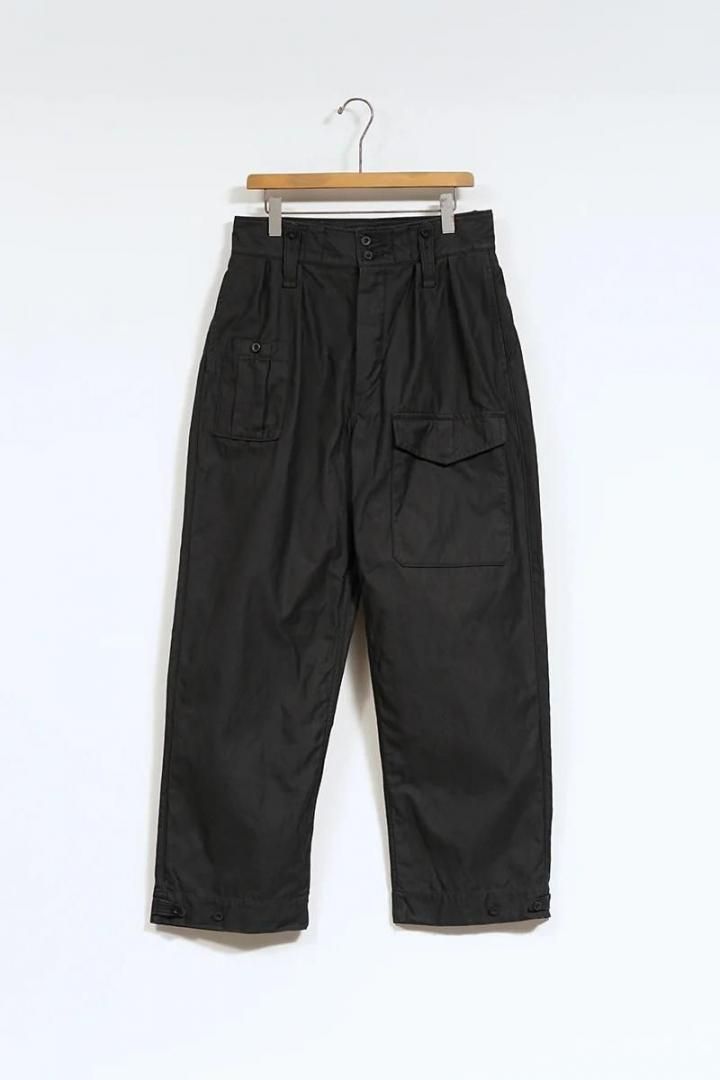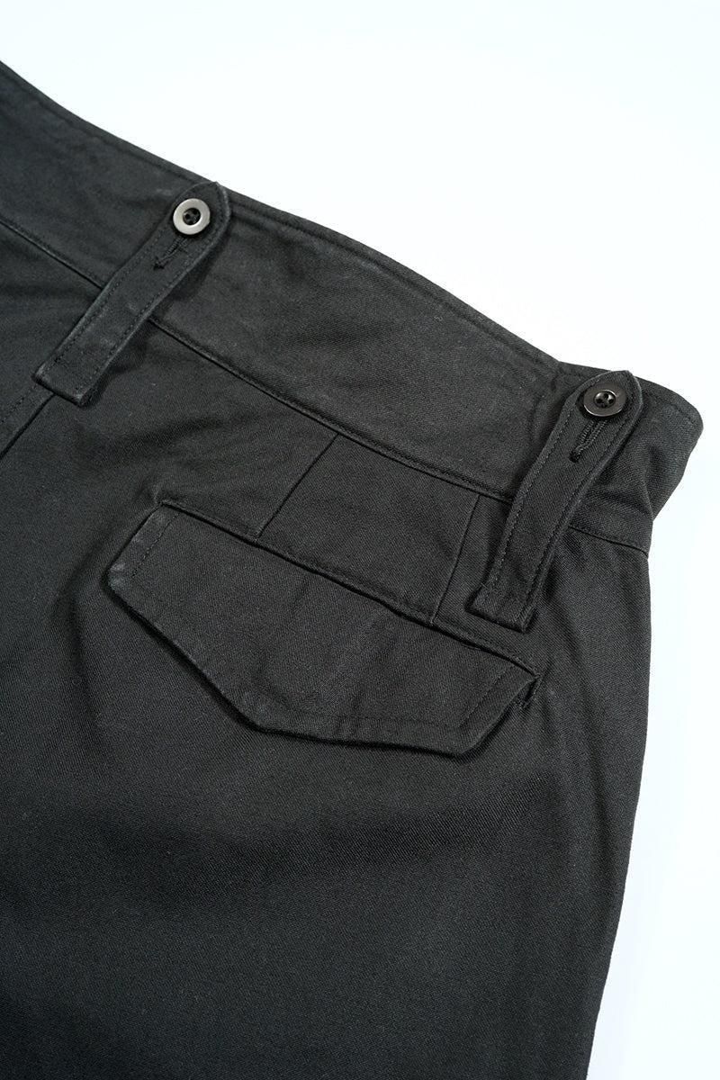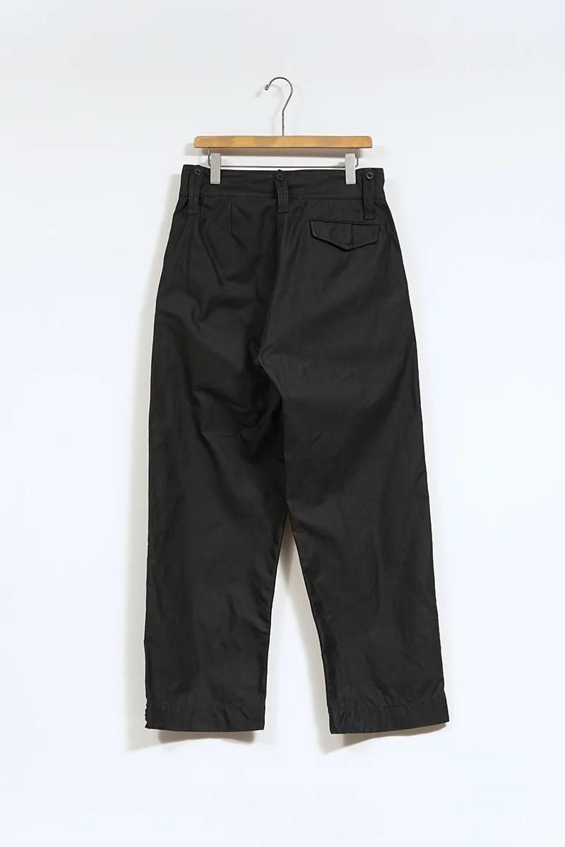 ブリティッシュアーミーパンツ、ブラックバージョン。1940年代のブリティッシュ・アーミーのバトルドレスパンツをベースに、1960年代のローデシア軍のバトルドレスパンツの要素をドッキングさせて、日本の生活様式に合うようにアレンジしました。特徴的なのは、ベルトループ。本来はピストルベルト用とされていたベルトループの向きを逆にして、より使いやすく機能的に変換しています。またベルト裏の仕様は1940年代のオフィサーズパンツの仕立てを分析し採用することによって、デザイン元はファティーグパンツの域でしたがオフィサーパンツの域まで昇格し価値転換しています。