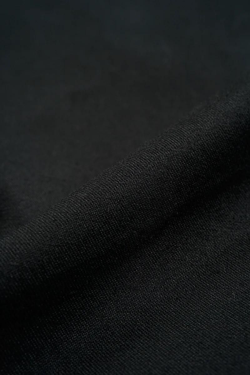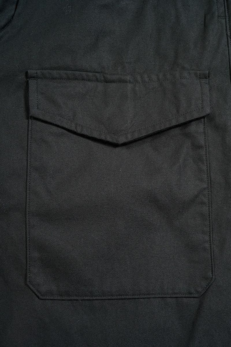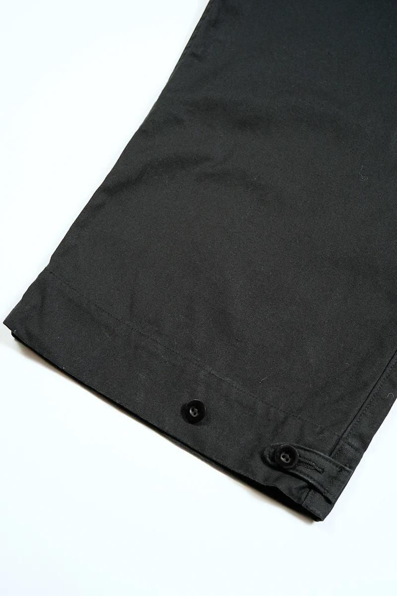 ブリティッシュアーミーパンツ、ブラックバージョン。1940年代のブリティッシュ・アーミーのバトルドレスパンツをベースに、1960年代のローデシア軍のバトルドレスパンツの要素をドッキングさせて、日本の生活様式に合うようにアレンジしました。特徴的なのは、ベルトループ。本来はピストルベルト用とされていたベルトループの向きを逆にして、より使いやすく機能的に変換しています。またベルト裏の仕様は1940年代のオフィサーズパンツの仕立てを分析し採用することによって、デザイン元はファティーグパンツの域でしたがオフィサーパンツの域まで昇格し価値転換しています。