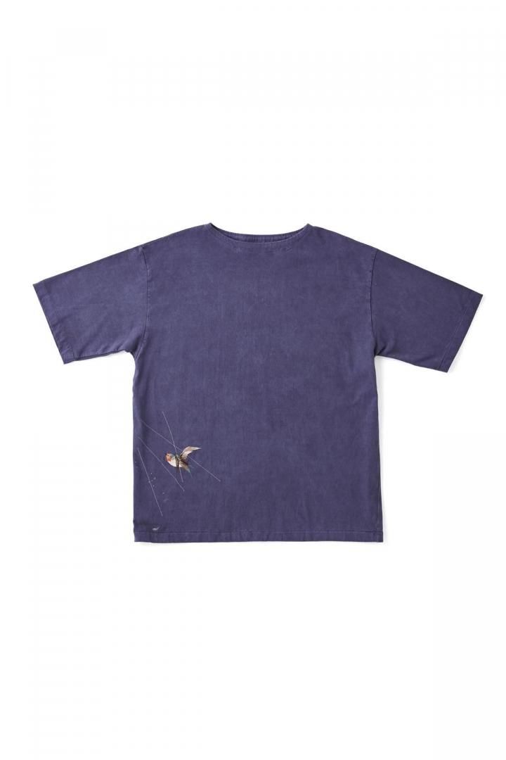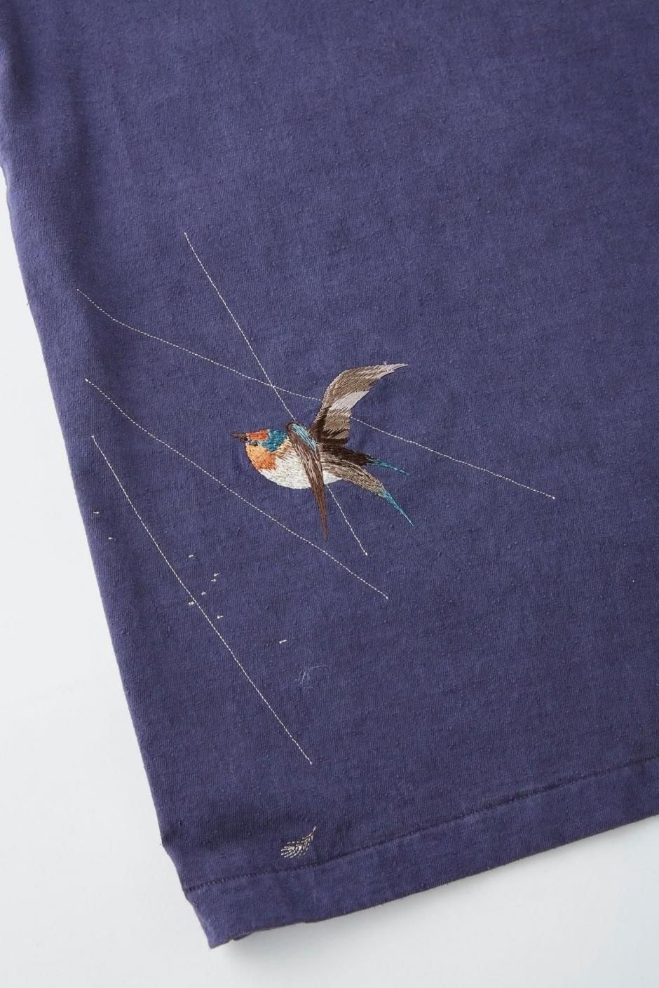 私たちのオリジナルデザインにより製作されるTシャツをベースに、それぞれにユニークなストーリーを持たせたデコレーションが他にはない存在感を放ちます。首リブを省かれ背裏がつくディテールはアーリーセンチュリー時代のスポーツウェアに散見することが出来る。またピグメントにより染められるカラーリングは深みと独特な質感が特徴的。そして日本の古き良き原風景を彷彿させる刺繍が、ノスタルジックなムードを醸し出す。