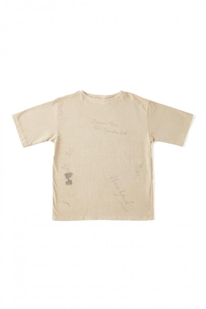 私たちのオリジナルデザインにより製作されるTシャツをベースに、それぞれにユニークなストーリーを持たせたデコレーションが他にはない存在感を放ちます。首リブを省かれ背裏がつくディテールはアーリーセンチュリー時代のスポーツウェアに散見することが出来る。硫化染料により生み出される淡い独特なトーンが特徴的。そしてアーカイブピースでも見られるような持ち主の素描が全面に入っており、見るだけでも楽しいピースに仕上がった。