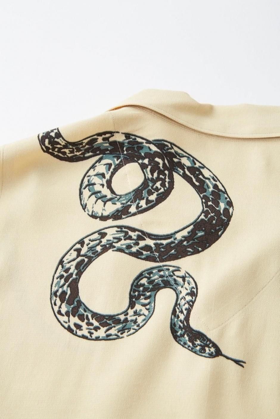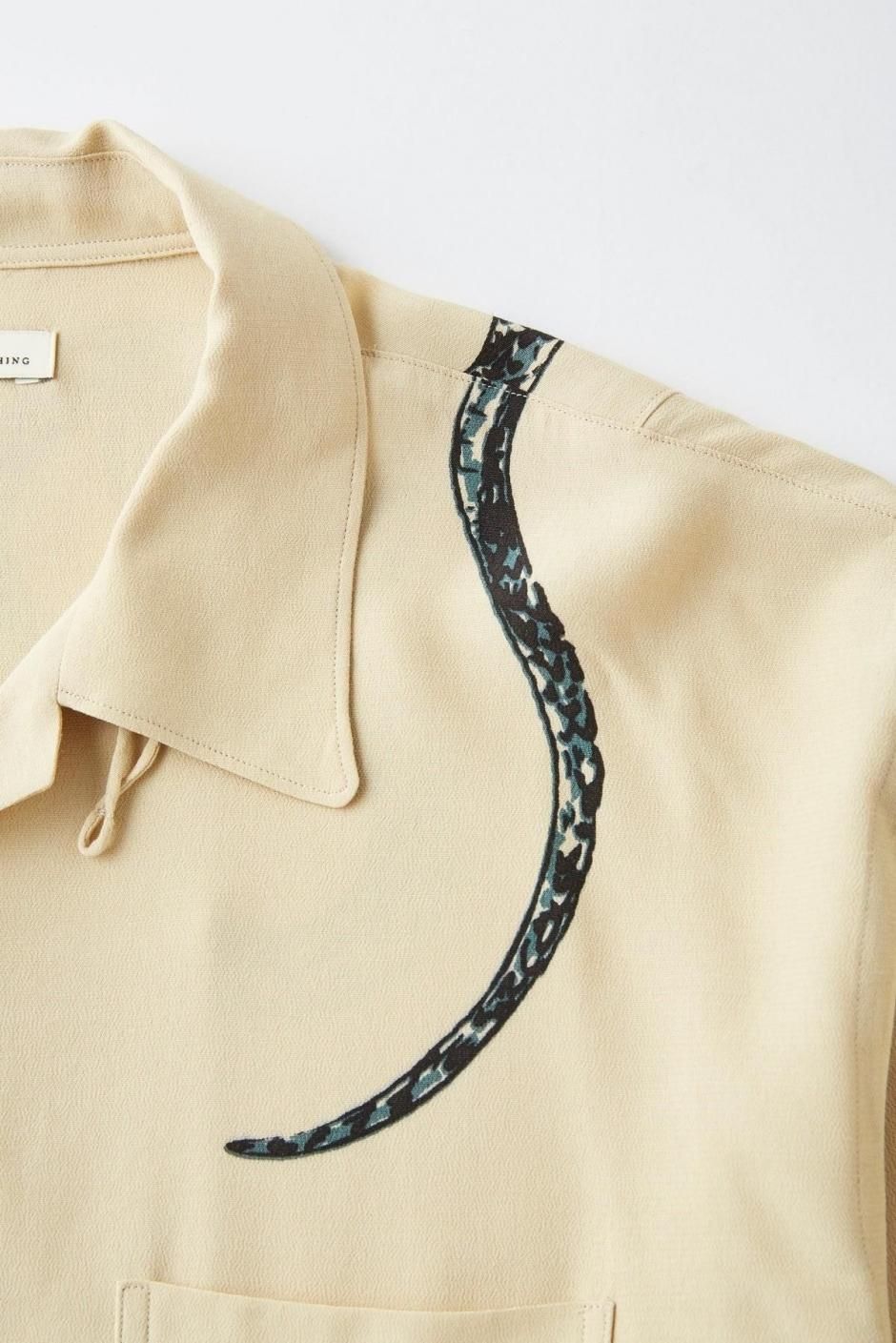 私たちの夏のシグネチャーピースの一つ、オリジナルテキスタイルのワンナップカラーシャツ。長く伸びたトップループ、バックヨークレスのディテール、アールの付いた襟先など、とてもクラシカルでいて上品な佇まいのこのシャツは1940〜50sのアーカイブピースからのインスピレーションによるもの。また毎シーズンアップデートされるテキスタイルも目を引きます。 “NUTS ART WORKS”のハンドドローイングによるユニークなタッチの蛇が他にはない存在感を醸し出す。