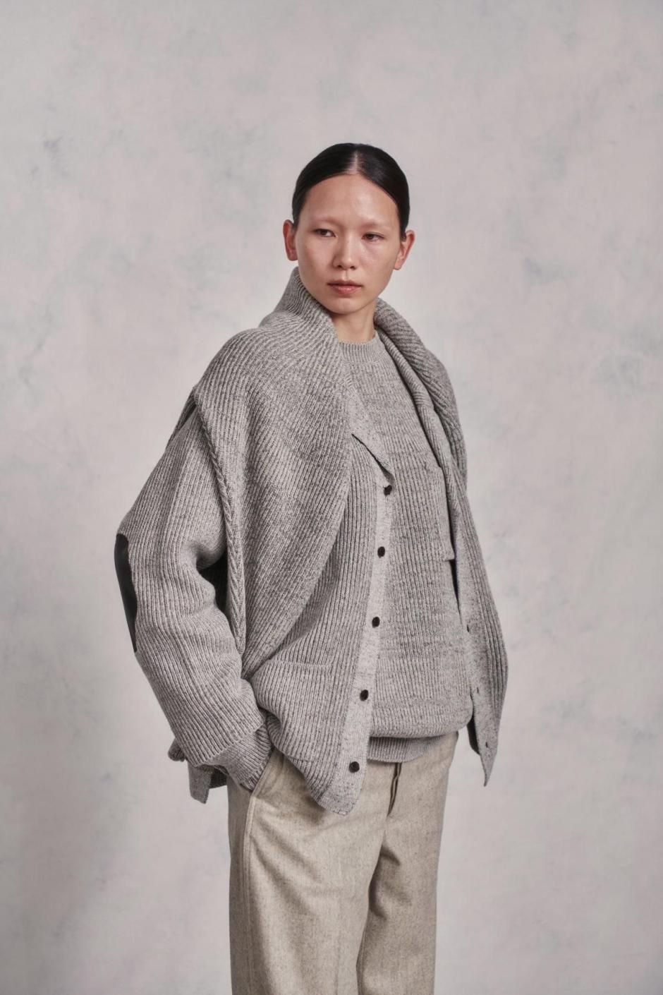 リネン混のケンピ糸にウールのストレート糸を片畦裏使いのプレーティングで7Gに編み上げた。プレーティングすることで片畦を編立た際により立体感がでる構造に仕上げた。ハリのあるリネンの効果で軽く上がりつつ型崩れしにくい編み組織も特徴。