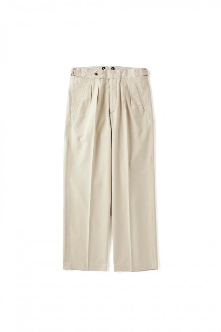 シグネチャーピースのスマーティートラウザー。1930’s頃のテーラードトラウザーからインスパイアされたクラシカルなディテールたちが目を引きます。ベルトループを省いたウエストバンドに職人技が光るモミ玉ポケットにD型カンヌキ、深めの股上とダブルプリーツをとったモダンなストレートラインのバランスは現代においてユニークな存在感を放ちます。