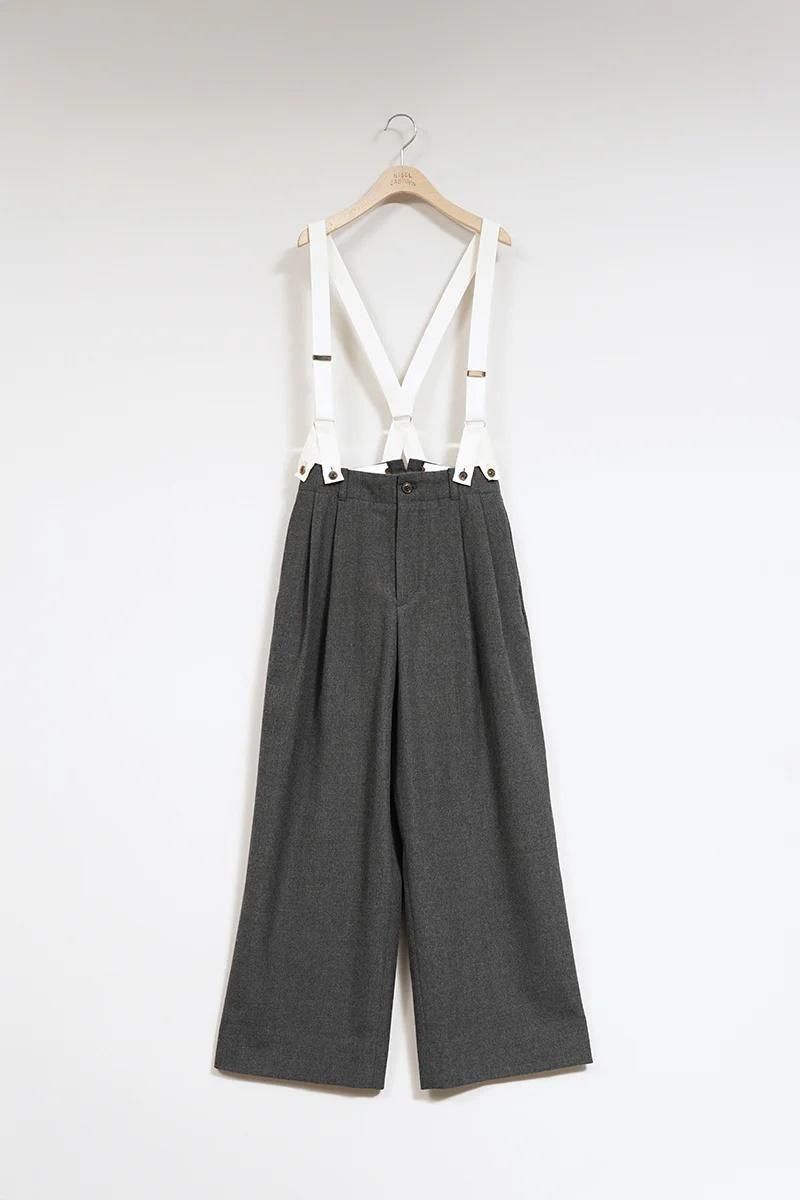 付属のサスペンダーは取り外し可能で、スタイリングに合わせて表情を変えられます。