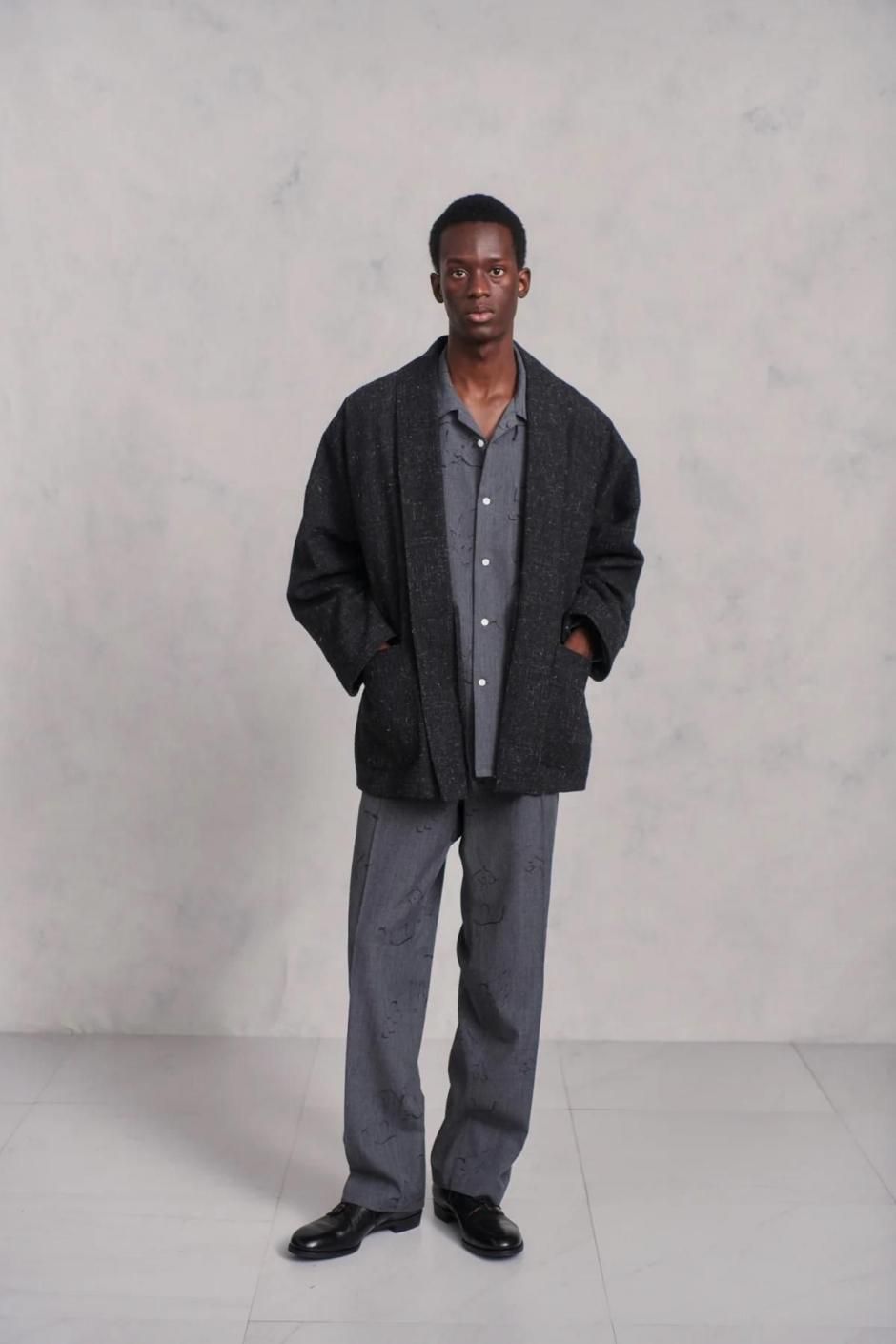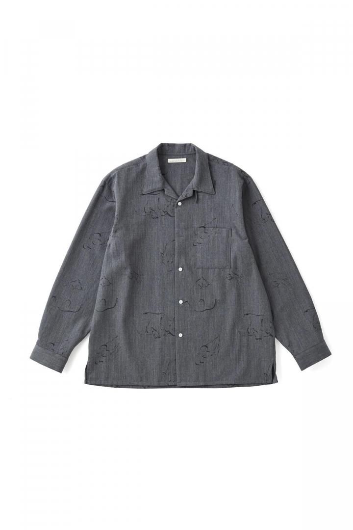 オリジナルパターンのワンナップカラーシャツ。長く伸びたトップループ、バックヨークレス、ラウンドした襟先などとてもクラシカルでいて上品なディテールは1940〜50sのアーカイブピースからのインスピレーション。今季はマテリアルをウールに置き換えてセットアップでラインナップ。日本画のような力強さを持ち、筆のストロークが際立つ動物のアウトラインは大らかでモダンな印象を見せる。