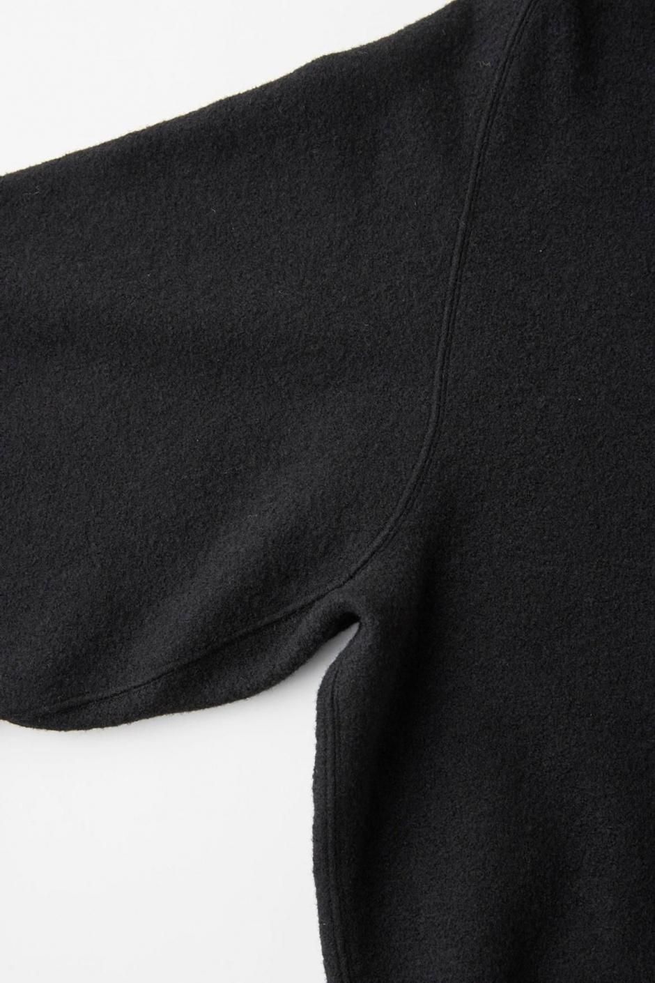 ウール繊維をリング状に整形したファンシーヤーンを使用し、12Gで編み上げたウールリング。リングヤーンならではのふっくらとした表情が魅力。ボリュームのあるリングヤーンで編んだふっくらとした天竺に、フライス加工を施して高密度にすることで、しっかりと厚みのある素材に仕上げた。