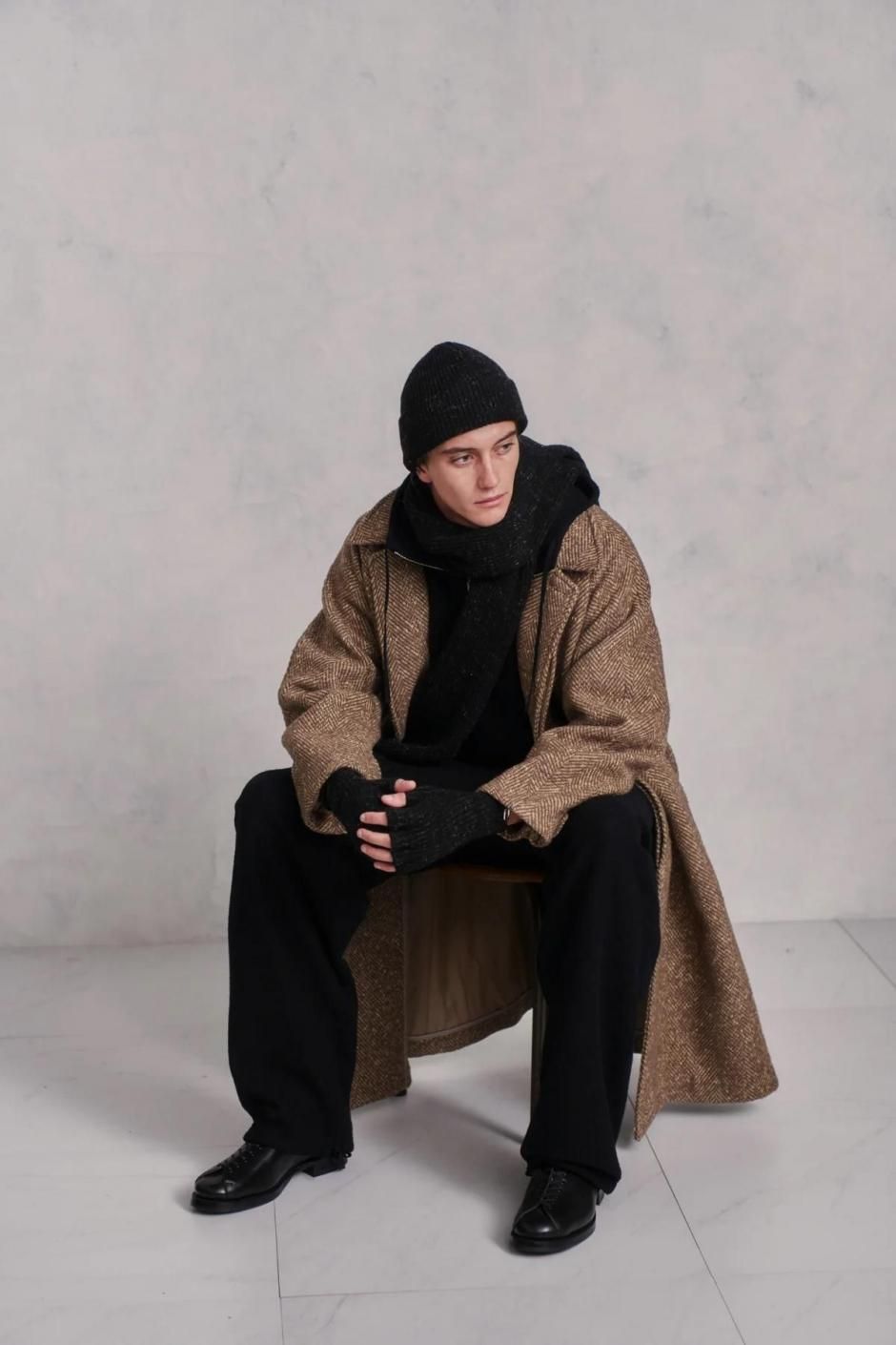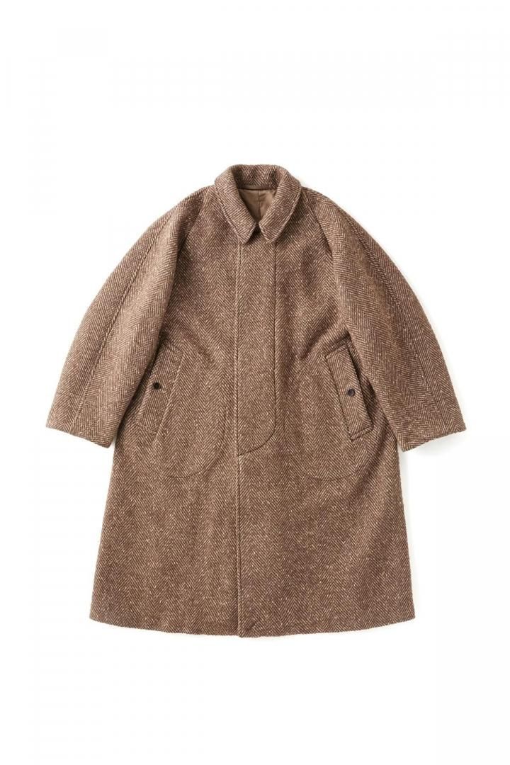 無駄を削ぎ落としたシンプルな佇まいのクラシカルなステンカラーコート。打掛用のベルト、前身頃裾の跳ね上げ式のデザイン、首元に控えめに配されたチンフラップやポケット周りのマチ仕様や 一点一点手作業によってエイジングが施されるバスケットレザーボタンなど あまり目にすることの出来ない昔ながらの美しき意匠設計が行き渡る。またベンチメイドで丁寧にハンドクラフトされた細部はとても美しいクオリティとなります。バックスタイルに配された深目のスリットは、フルオープンにすることでクラシックな空気感の中で一際ユニークな存在に映るでしょう。また古き良き時代を彷彿させるかのようなクラシカルな佇まいを持つざっくり編みの太番手ヘリンボーンが目を引く。4種の糸で構成し織り上げている為、表面の凹凸感が他にない存在感を醸し出します。凛々しい表情に相反するかのように軽やかな羽織り心地を持つ。動く度に布が綺麗に舞うようにと、マテリアルのウエイトにまでOLDJOEの意匠設計を垣間見ることができる。