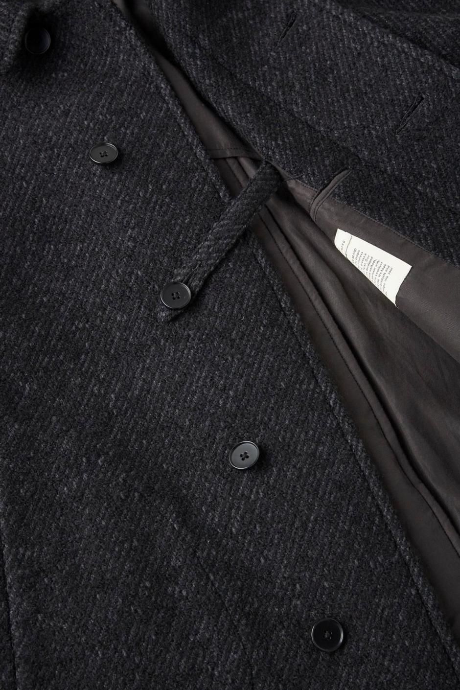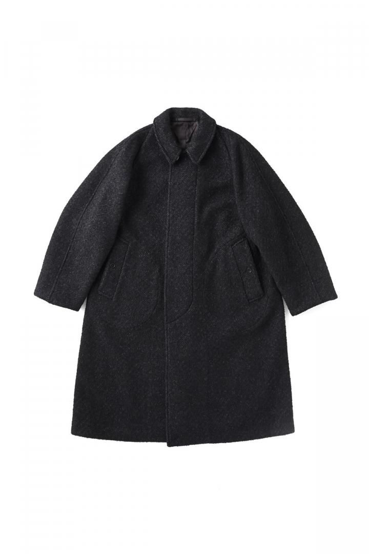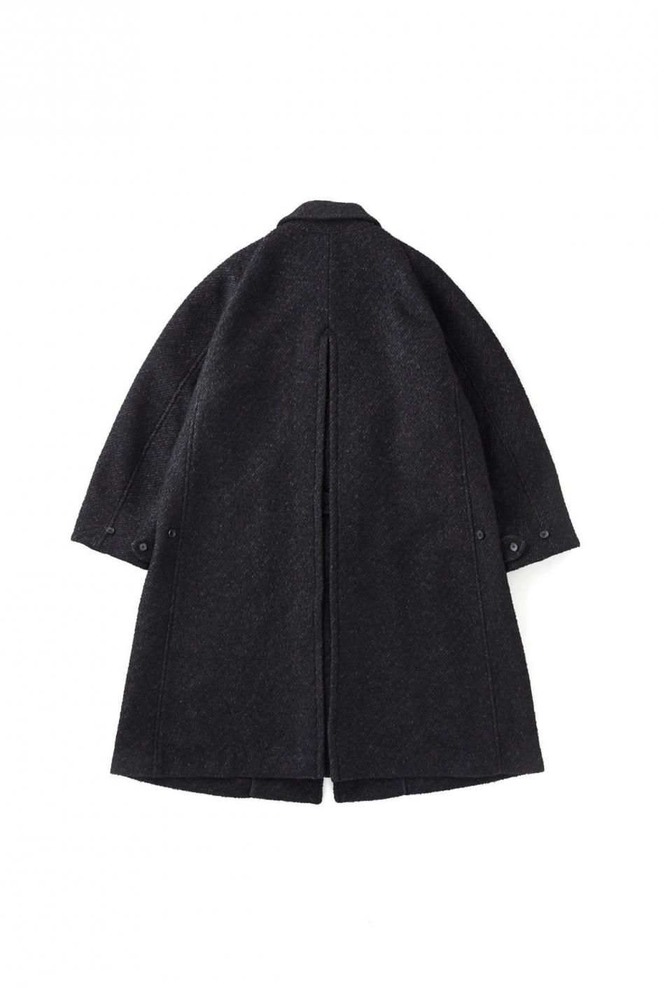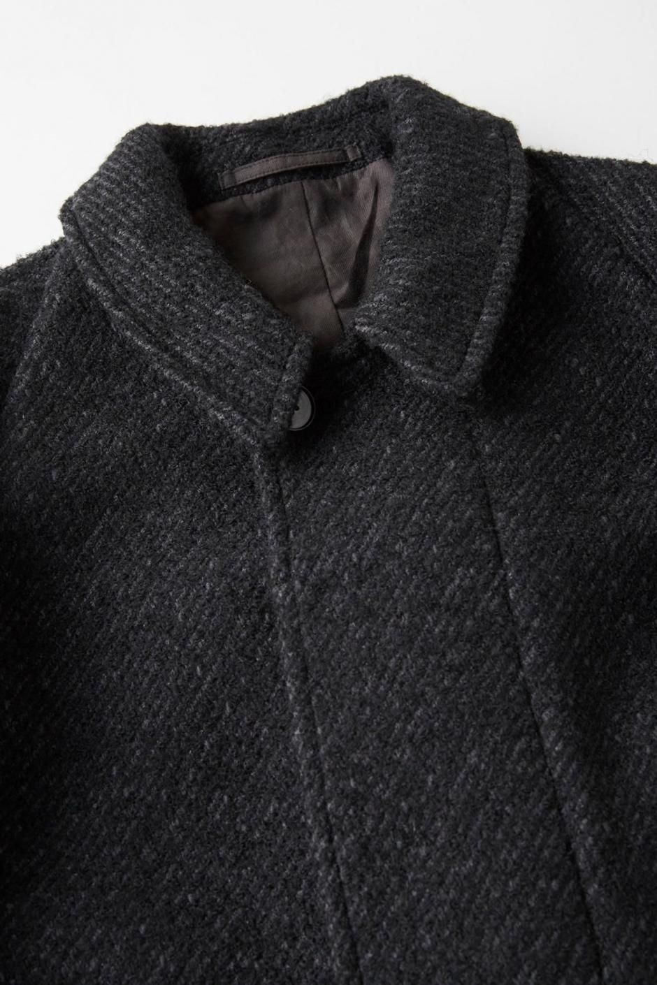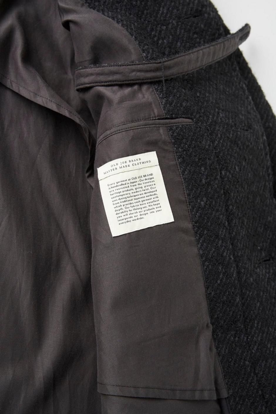 無駄を削ぎ落としたシンプルな佇まいのクラシカルなステンカラーコート。打掛用のベルト、前身頃裾の跳ね上げ式のデザイン、首元に控えめに配されたチンフラップやポケット周りのマチ仕様や 一点一点手作業によってエイジングが施されるバスケットレザーボタンなど あまり目にすることの出来ない昔ながらの美しき意匠設計が行き渡る。またベンチメイドで丁寧にハンドクラフトされた細部はとても美しいクオリティとなります。バックスタイルに配された深目のスリットは、フルオープンにすることでクラシックな空気感の中で一際ユニークな存在に映るでしょう。また古き良き時代を彷彿させるかのようなクラシカルな佇まいを持つざっくり編みの太番手ヘリンボーンが目を引く。4種の糸で構成し織り上げている為、表面の凹凸感が他にない存在感を醸し出します。凛々しい表情に相反するかのように軽やかな羽織り心地を持つ。動く度に布が綺麗に舞うようにと、マテリアルのウエイトにまでOLDJOEの意匠設計を垣間見ることができる。
